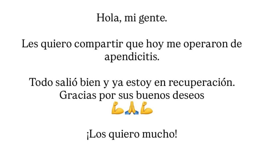 “Hola, mi gente. Les quiero compartir que hoy me operaron de apendicitis. Todo salió bien y ya estoy en recuperación. Gracias por sus buenos deseos. ¡Los quiero mucho!”